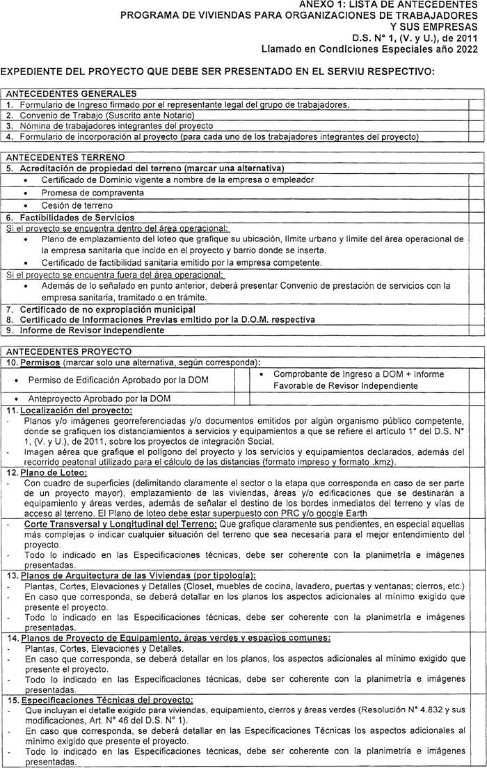 El terreno deberá contar con los certificados de factibilidad de dación de servicios correspondientes y con V°B° de un revisor independiente; certificado de no expropiación municipal y certificado de informaciones previas emitido por la Dirección de Obras Municipales respectiva. En caso de no alcanzar a contar con el V°B° del revisor independiente a la fecha de cierre del llamado, se podrá postergar la entrega del informe hasta 45 días corridos después de la fecha de cierre del llamado.