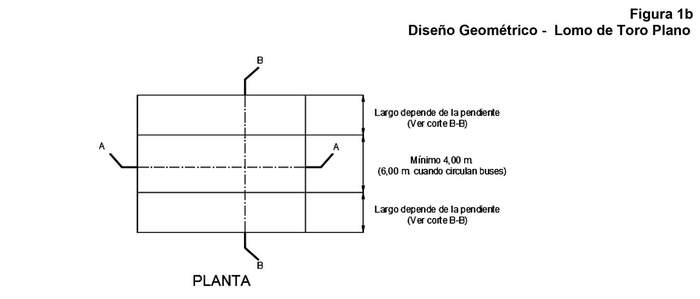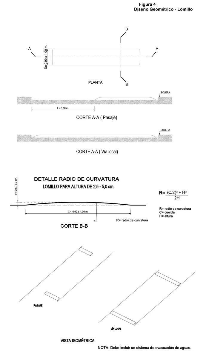 "Los lomillos deberán instalarse en pasajes, y en serie, con un mínimo de dos, no debiendo abarcar todo el ancho de la calzada, sino que manteniendo en ésta un espacio libre de 1,5 m. Deben ubicarse en forma alternada a cada lado de la faja pavimentada, debiendo mediar entre sus bordes más cercanos una distancia de entre 6 y 10 m.".