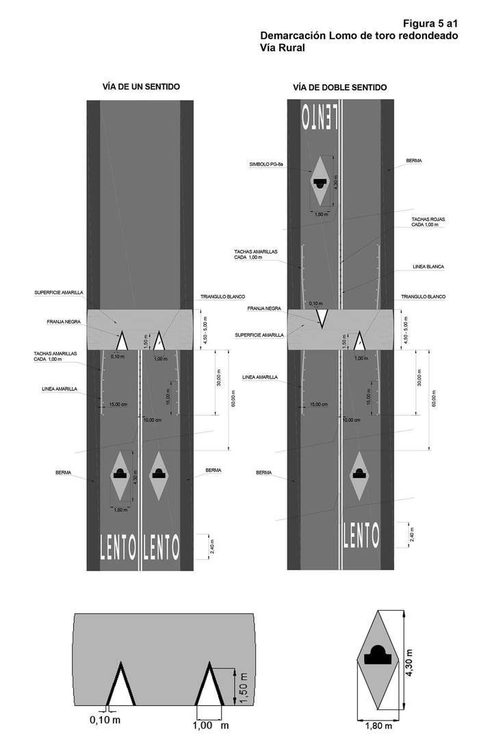 "Cuando los lomos de toro o plataformas estén ubicados en vías rurales, las velocidades máximas permitidas deberán reducirse gradualmente antes del resalto, y será necesario restituir la velocidad en general de acuerdo a lo indicado en el Manual de Carreteras de la Dirección de Vialidad del Ministerio de Obras Públicas. En todo caso, la velocidad máxima señalizada en el entorno directo del resalto no podrá ser mayor a 50 km/h.".