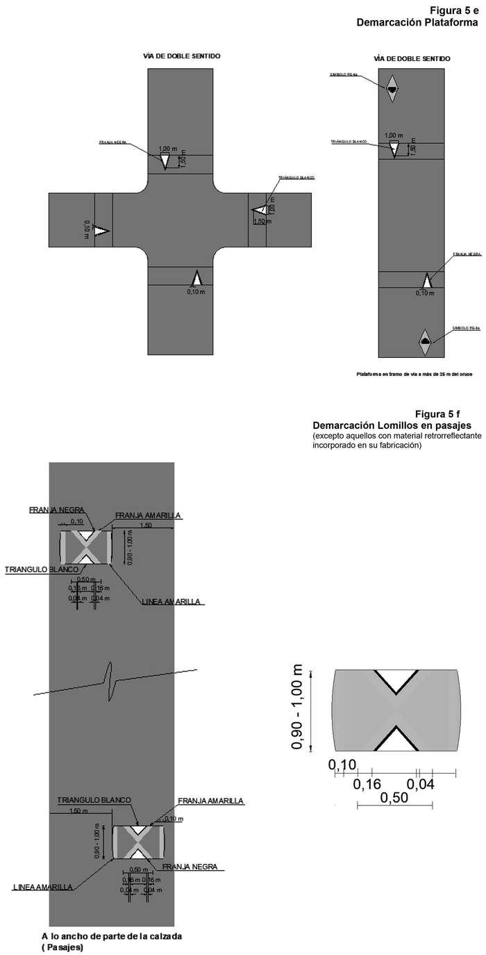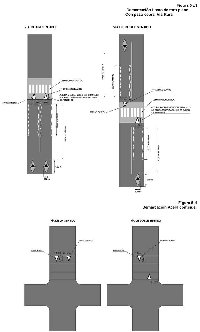 En el caso de lomos de toro planos y plataformas con paso cebra -con la excepción de aquellos con su superficie claramente diferente del resto de la calzada- deben proveerse las demarcaciones indicadas en el Manual de Señalización de Tránsito para estas facilidades peatonales, no requiriéndose las demás demarcaciones referidas en este decreto, con excepción de los triángulos.