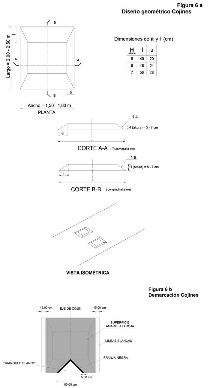 "Artículo 13: Los resaltos reductores de velocidad deberán ser demarcados con un triángulo isósceles blanco, enfrentado la circulación de cada pista. Se exceptúan de lo anterior las aceras continuas y las plataformas ubicadas a menos de 25 m. de un cruce, en el caso del flujo proveniente de una intersección y/o cuando su superficie sea claramente diferente del resto de la calzada, como es el caso de adoquines u otro tipo de pavimento similar.