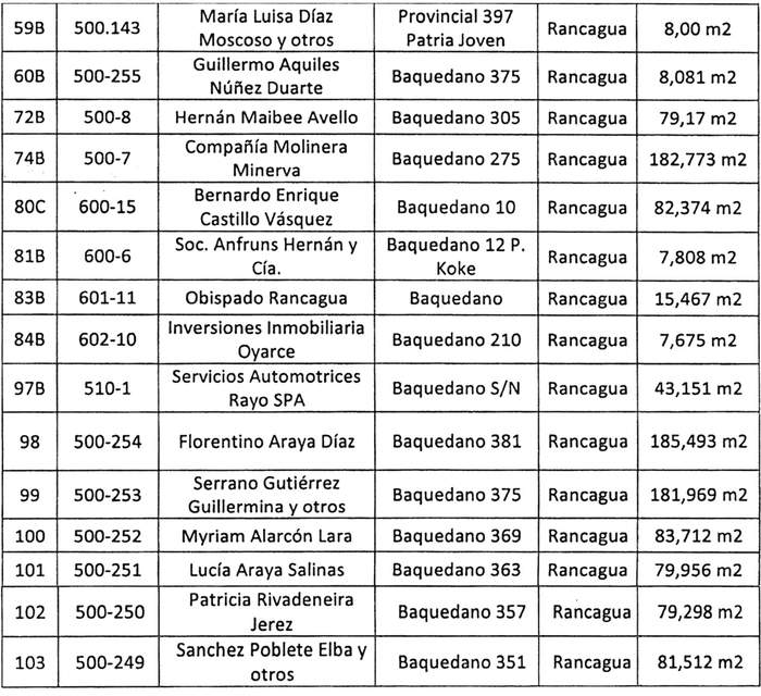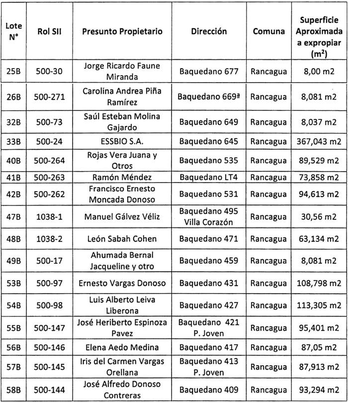 1. Apruébase el programa de expropiaciones para la implementación del Proyecto "Ampliación Avenida Baquedano, Rancagua", Código BIP Nº 30118748-0, en la comuna de Rancagua, de la Región del Libertador General Bernardo O'Higgins, de una superficie de 2.463,136 m2, que corresponde a 31 inmuebles, necesaria para dar cabida a los perfiles viales proyectados, según el plano de Ampliación Planta Expropiaciones Avenida Baquedano, Proyecto de Febrero de 2022, del Serviu de la Región del Libertador Bernardo O'Higgins, a escala 1/500, adjunto a Ord. Nº 2048 citado; referido a los lotes que se indican a continuación: