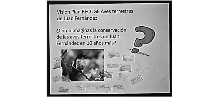 Para el desarrollo de este Plan RECOGE de las Aves Terrestres de Juan Fernández, se desarrollaron talleres presenciales tanto insulares como continentales, así como también talleres virtuales. El documento construido con los insumos de estos talleres fue socializado con la comunidad local, los servicios públicos y ONG presentes en la isla, así como también aquellos con competencias e intereses en el territorio,
