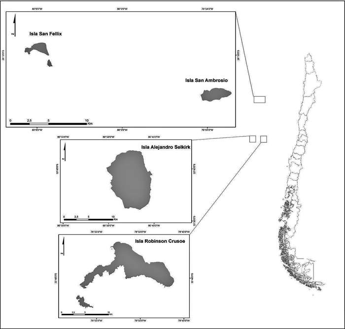En la isla Alejandro Selkirk destaca la presencia de los mismos roedores que en Robinson Crusoe (rata, laucha y guarén) y los gatos asilvestrados, además de contar también con las plantas invasoras como la mora, murta y maqui. Para el caso de las Islas Desventuradas, existe presencia de cabras, y plantas como el Mesembryanthemum crystallinum en San Ambrosio, y presencia de gatos en San Félix.