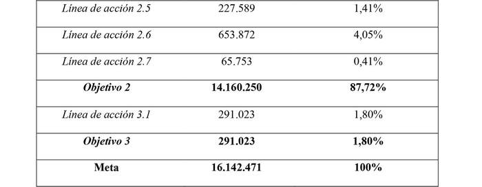 Tabla 3: Costos por meta (dólares norteamericanos, USD), objetivo y línea de acción del plan y su porcentaje relativo del total (%).