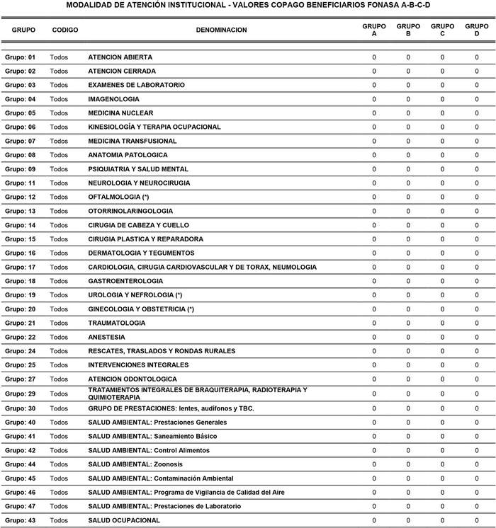Actualízase el Arancel de Prestaciones de la Modalidad de Atención Institucional para todos los grupos de prestaciones en el sentido que el porcentaje de contribución estatal será de un 100%. Con ello, todos los beneficiarios del Fondo Nacional de Salud tendrán un copago cero o gratuidad en atenciones definidas en este arancel.