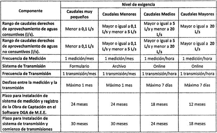 Cuadro N° 1. Niveles de exigencia para las obras de captación de aguas superficiales que se encuentran ubicadas en la Región de Atacama, específicamente en las cuencas: Río Salado, Costeras e Islas entre Río Salado y Río Copiapó, Costeras entre Río Copiapó y Quebrada Totoral, Quebrada Totoral y Costeras hasta Quebrada Carrizal, Quebrada Carrizal y Costeras hasta Río Huasco, y Costeras e Islas entre Río Huasco y Cuarta Región.