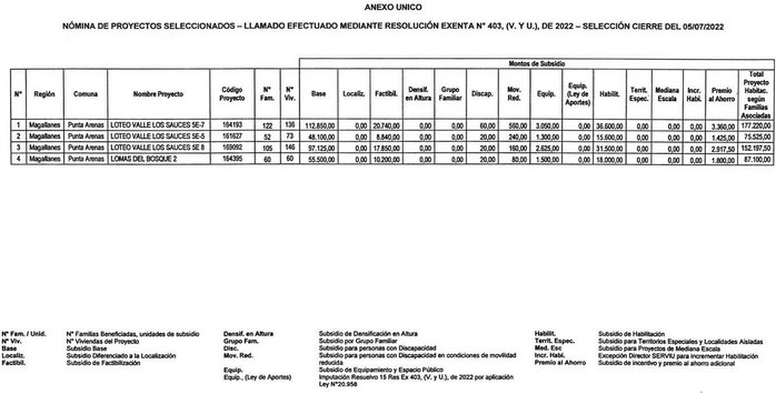 2. Apruébase la nómina de proyectos seleccionados con su respectivo financiamiento total, para el otorgamiento de subsidios del Programa Habitacional Fondo Solidario de Elección de Vivienda, en la alternativa de postulación colectiva, para proyectos de Construcción en Nuevos Terrenos, en la Región de Magallanes y de la Antártica Chilena, correspondiente al proceso de selección cuyo cierre de postulación se verificó el día 5 de julio de 2022, del llamado efectuado por la resolución exenta N° 403 (V. y U.), de 2022: