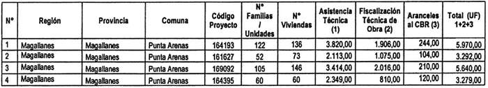 3. El monto del subsidio asignado de conformidad con el cuadro señalado en el Resuelvo 2. de esta resolución comprende los siguientes valores, en Unidades de Fomento, por concepto de Servicios de Asistencia Técnica, de Labores de Fiscalización Técnica de Obra y pago de Aranceles al Conservador de Bienes Raíces: