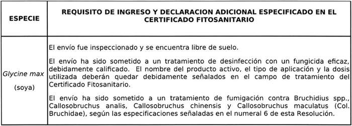 1.1 Reemplázase en el resuelvo Nº 1 la especie "Glycine max (soya)" y sus requisitos de ingreso y declaraciones adicionales que deben ser especificados en el certificado fitosanitario, quedando de la siguiente forma:
