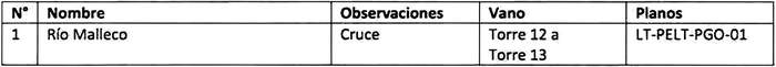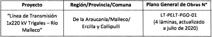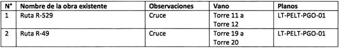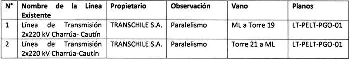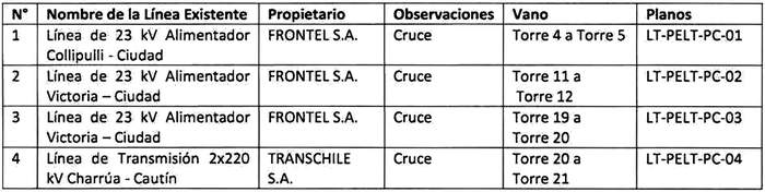 En su recorrido, el proyecto "Línea de Transmisión 1x220 kV Trigales - Río Malleco" afectará las líneas eléctricas, obras e instalaciones existentes que se indica a continuación: