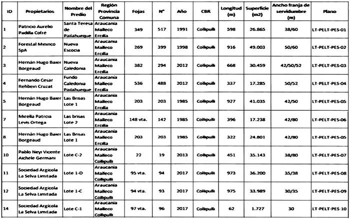 Artículo 7.- Constitúyanse, de acuerdo con lo establecido en la Ley General de Servicios Eléctricos, las servidumbres eléctricas para el establecimiento de las instalaciones del proyecto "Línea de Transmisión 1x220 kV Trigales - Río Malleco" en los predios que se indican a continuación: