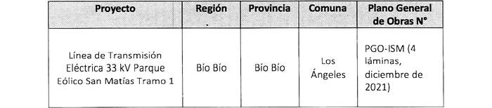 Conforme a lo anterior, la Línea de Transmisión Eléctrica 33 kV Parque Eólico San Matías, proyectada, corresponde al Sistema de Transmisión Dedicado del Parque Eólico San Matías. De dichas instalaciones, sólo se solicita concesión eléctrica definitiva por un tramo de la Línea de Transmisión Eléctrica 33 kV Parque Eólico San Matías, el cual comienza en el vértice PI1 y finaliza en el vértice V24-PF2.