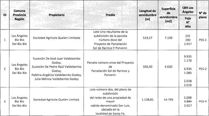 Artículo 7º.- Constitúyase, de acuerdo con lo que sobre el particular establece la Ley General de Servicios Eléctricos, la servidumbre para el establecimiento de la línea de transmisión en los predios particulares que se indican a continuación: