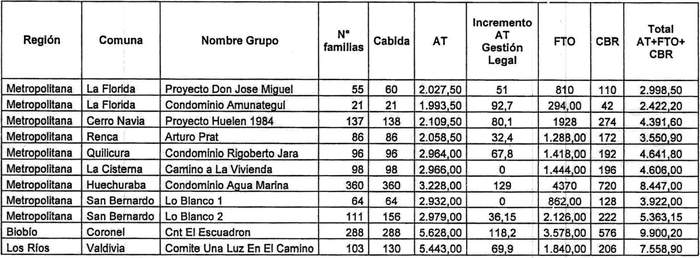 4. Asígnase a los grupos organizados seleccionados en el Resuelvo 2. de la presente resolución exenta, por concepto de pago por los Servicios de Asistencia Técnica, por las Labores de Fiscalización Técnica de Obra y pago de Aranceles al Conservador de Bienes Raíces para el desarrollo de sus proyectos, los montos expresados en Unidades de Fomento que se detallan a continuación: