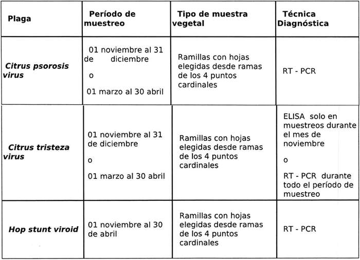 Tabla N° 2. Período de muestreo de plantas madres, tipo de muestra vegetal y técnica diagnóstica para las PNCR de cítricos.