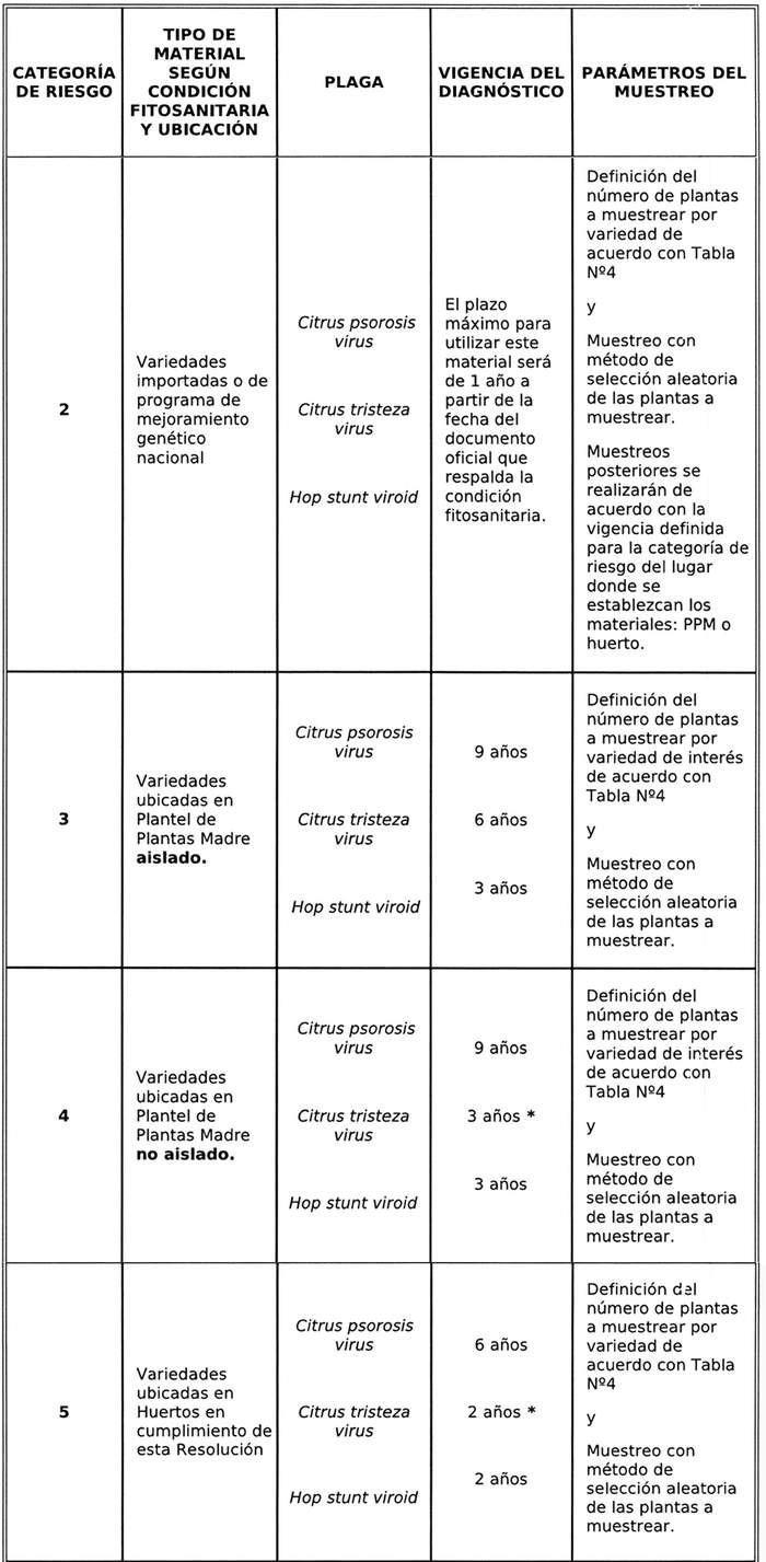 La vigencia de los diagnósticos será de 1 o más años contados desde la fecha de muestreo y calculados para cada plaga de acuerdo con la categoría de riesgo de las plantas madres según las vigencias señaladas en la tabla 3.