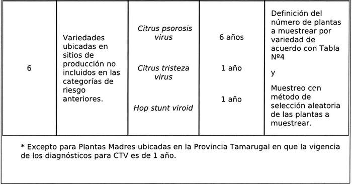 Categoría de riesgo 5 (CR5): Plantas de huertos nuevos en cumplimiento de la actual normativa. Corresponde a las plantas madres que están en sitios de producción ubicados en huertos, cuyas plantas fueron producidas cumpliendo con los requisitos de esta normativa, es decir origen fitosanitario autorizado, conocido y trazable para PNCR de cítricos.