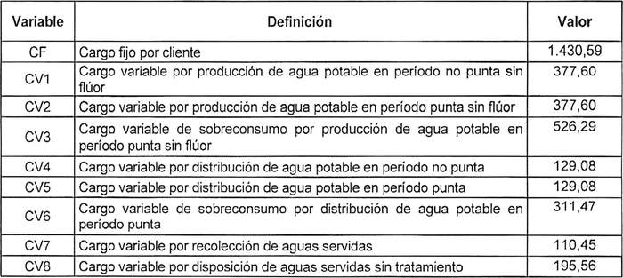 La definición de las variables incorporadas en las fórmulas tarifarias anteriores y sus respectivos valores, al 30 de noviembre de 2020, son los indicados a continuación: