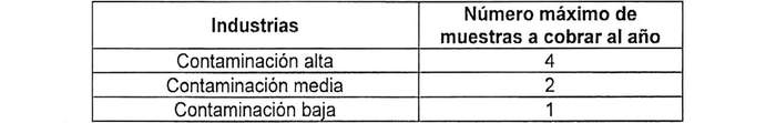 Los valores y número máximo de muestras a cobrar al año se han determinado de acuerdo a la clasificación de las industrias según el nivel de contaminación del efluente evacuado, cuya definición se indica a continuación: