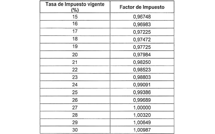 Los valores resultantes de la aplicación de los cargos anteriormente mencionados en este decreto, se incrementarán en función de la tasa de tributación vigente que grava las utilidades de las sociedades anónimas abiertas, considerando los factores para las tasas de tributación que se indican a continuación (tasas intermedias se interpolarán linealmente):