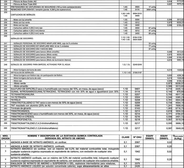 El cálculo relacionado con la "Cantidad en kilos de Dinamita 60%", es realizado a todos los productos clasificados como "Explosivos", sin excepción. Respecto a las sustancias químicas, este cálculo es realizado solamente a las "Sustancias químicas controladas derivadas del nitrato de amonio (artículo 242 del Regto. Complementario)", las cuales se encuentran en este listado, a continuación de los productos explosivos.