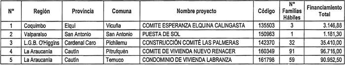 2. Apruébase la nómina de proyectos seleccionados con su respectivo financiamiento total, para el otorgamiento de subsidios del Programa Habitacional Fondo Solidario de Elección de Vivienda en la alternativa de postulación colectiva, para proyectos de Construcción en Nuevos Terrenos, en las Regiones de Coquimbo, Valparaíso, L.G.B. O'Higgins y la Araucania, correspondiente al proceso de selección cuyo cierre de postulación se verificó el día 28 de julio de 2022, del llamado efectuado por resolución exenta Nº 399 (V. y U.), de 2022: