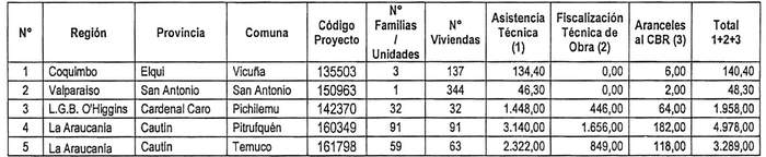 3. El monto del subsidio asignado de conformidad con el cuadro del Resuelvo 2. de esta resolución comprende los siguientes valores por concepto de Servicios de Asistencia Técnica, de Labores de Fiscalización Técnica de Obra y pago de Aranceles al Conservador de Bienes Raíces: