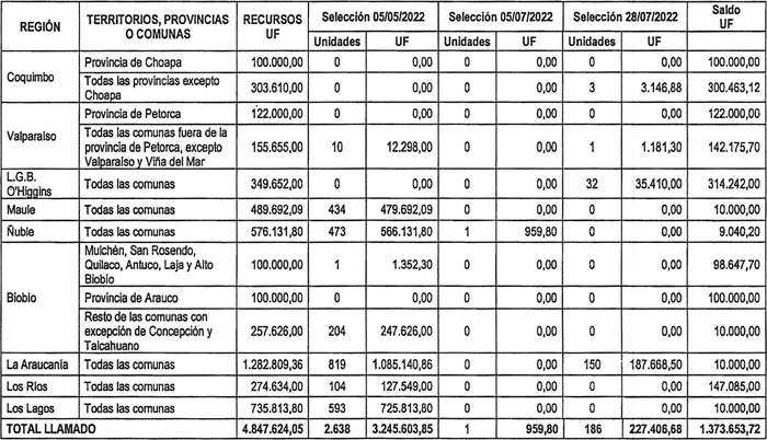 4. Los recursos comprometidos en el resuelvo 2. de la presente resolución, para los proyectos seleccionados en el concurso a que se llamó por resolución exenta Nº 399 (V. y U.), de 2022, cuyo cierre de postulación se efectuó el día 28 de julio de 2022, se resumen en el siguiente cuadro para cada región del país, incluyendo la suma total de familias beneficiadas y las Unidades de Fomento comprometidas, considerando los montos de subsidio de los proyectos, incluidos sus respectivos servicios de asistencia técnica y fiscalización técnica de obras: