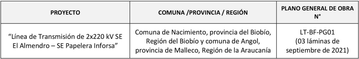 La Línea de Transmisión de 2x220 kV SE El Almendro - SE Papelera Inforsa se ubica en las comunas de Nacimiento, provincia de Biobío, Región del Biobío y en la comuna de Angol, provincia de Malleco, Región de la Araucanía. El recorrido o trazado físico de esta línea comienza en el Punto de Inicio (Pi) ubicado en el marco de línea al interior de la Subestación El Almendro, y finaliza en el punto final definido como (Pf) ubicado en el marco de línea al interior de la Subestación Papelera Inforsa. La longitud total de esta línea es de 22.066,58 metros, la cual se presenta con la finalidad de contextualizar el proyecto.