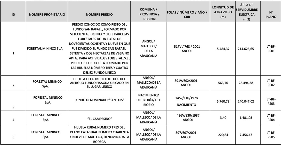 Artículo 5º.- "Tramo de Línea de Transmisión de 2x220 kV SE El Almendro - SE Papelera Inforsa" ocupará bienes nacionales de uso público y afectarán predios particulares, respecto de estos últimos será necesario constituir servidumbre eléctrica en los términos que señala la Ley General de Servicios Eléctricos. Asimismo, se hace presente que el proyecto no contempla afectación de bienes fiscales, ni bienes municipales.