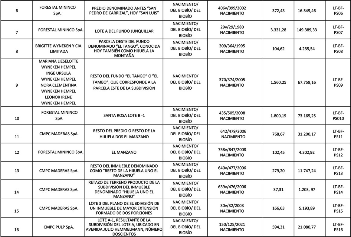 Artículo 7º.- Constitúyase, de acuerdo con lo que sobre el particular establece la Ley General de Servicios Eléctricos, las servidumbres para el establecimiento del proyecto "Tramo de Línea de Transmisión de 2x220 kV SE El Almendro - SE Papelera Inforsa", en los predios que se indican a continuación: