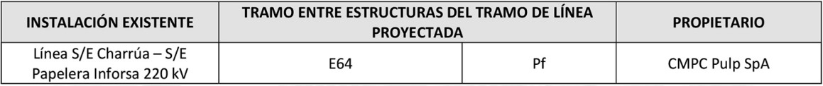 En su recorrido, el proyecto "Línea de Transmisión de 2x220 kV SE El Almendro - SE Papelera Inforsa" afectará las siguientes líneas eléctricas u obras e instalaciones existentes: