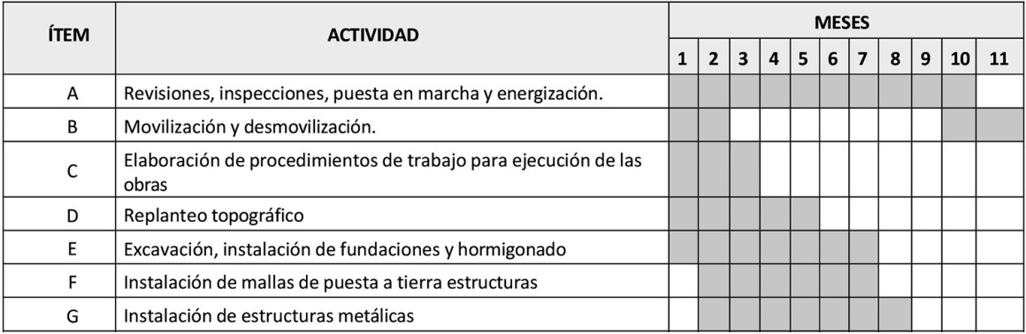 Artículo 11º.- El plazo de construcción de las obras será de 11 meses contados desde el inicio de los trabajos hasta su terminación. Dicho plazo comenzará a transcurrir cumplidos 90 días hábiles desde la reducción a escritura pública del respectivo decreto de concesión eléctrica definitiva. Los plazos para la iniciación de los trabajos y su terminación por etapas y secciones son los siguientes: