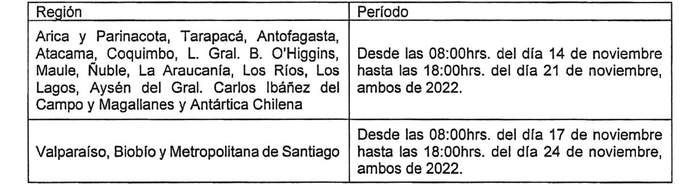 2. Las postulaciones al presente llamado solo podrán efectuarse por vía electrónica, mediante el sistema informático que se dispondrá al efecto, en los siguientes períodos según la región consignada en el Registro Social de Hogares del postulante: