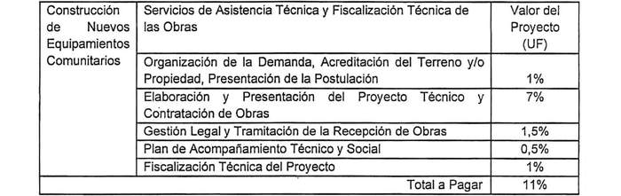 35. Tratándose de la Construcción de Nuevos Equipamientos Comunitarios, el valor único a pagar por cada Servicio de Asistencia Técnica y Fiscalización Técnica de las Obras, corresponderá al establecido en la tabla siguiente, procediendo su pago bajo las condiciones establecidas en la resolución exenta N° 3.131 (V. y U.), de 2016: