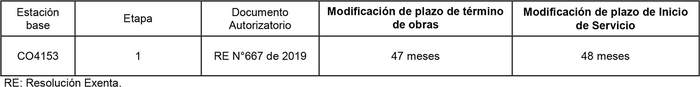 1. Autorízase a la concesionaria para modificar los plazos de inicio de servicio y término de obras de una (1) estación base, según se indica a continuación:
