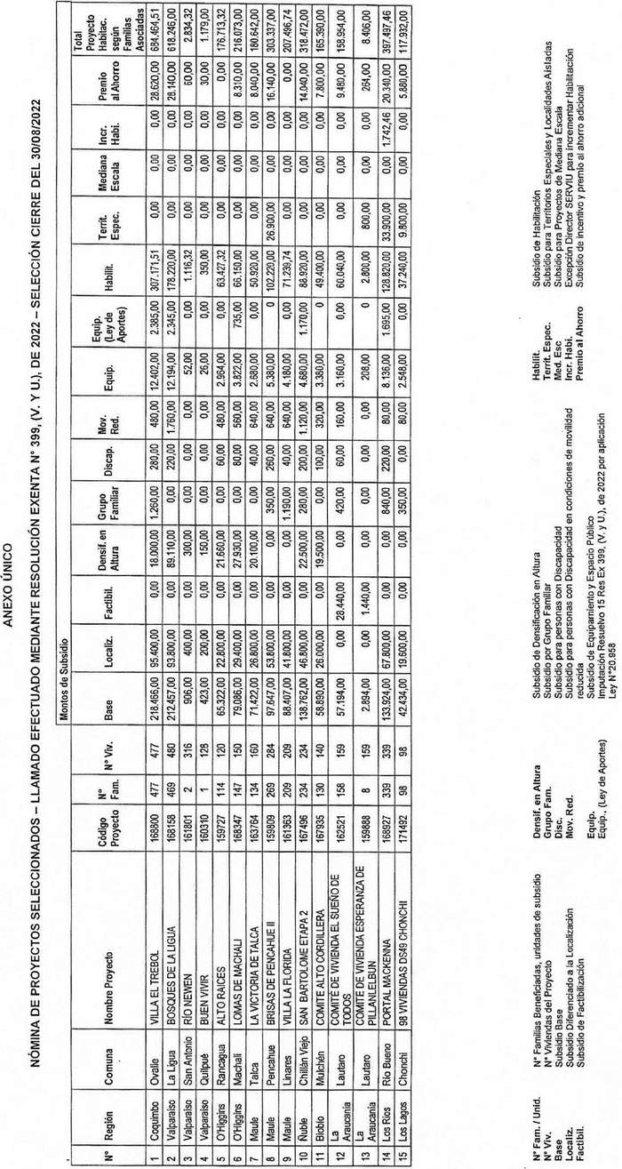 2. Apruébase la siguiente nómina de proyectos seleccionados, con su respectivo financiamiento total, para el otorgamiento de subsidios del Programa Habitacional Fondo Solidario de Elección de Vivienda, en la alternativa de postulación colectiva, para proyectos de Construcción en Nuevos Terrenos, en las regiones de Coquimbo, Valparaíso, O'Higgins, Maule, Ñuble, Biobío, La Araucanía, Los Ríos y Los Lagos, correspondiente al proceso de selección cuyo cierre de postulación se verificó el día 30 de agosto de 2022, del llamado efectuado por resolución exenta N° 399 (V. y U.), de 2022: