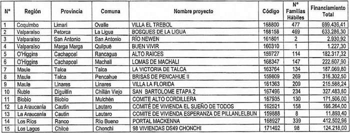 2. Apruébase la siguiente nómina de proyectos seleccionados, con su respectivo financiamiento total, para el otorgamiento de subsidios del Programa Habitacional Fondo Solidario de Elección de Vivienda, en la alternativa de postulación colectiva, para proyectos de Construcción en Nuevos Terrenos, en las regiones de Coquimbo, Valparaíso, O'Higgins, Maule, Ñuble, Biobío, La Araucanía, Los Ríos y Los Lagos, correspondiente al proceso de selección cuyo cierre de postulación se verificó el día 30 de agosto de 2022, del llamado efectuado por resolución exenta N° 399 (V. y U.), de 2022: