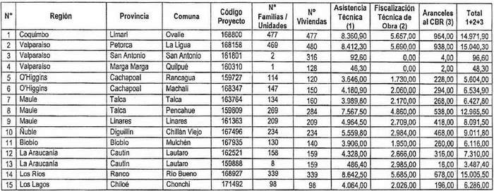 3. El monto del subsidio asignado de conformidad con el cuadro del Resuelvo 2. de esta resolución comprende los siguientes valores por concepto de Servicios de Asistencia Técnica, de Labores de Fiscalización Técnica de Obra y pago de Aranceles al Conservador de Bienes Raíces: