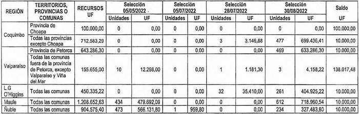 4. Los recursos comprometidos en el Resuelvo 2. de la presente resolución, para los proyectos seleccionados en el cierre de postulación efectuado el día 30 de agosto de 2022, del concurso a que se llamó por resolución exenta N° 399 (V. y U.), de 2022, se resumen en el siguiente cuadro para cada región del país, incluyendo la suma total de familias beneficiadas y las Unidades de Fomento comprometidas, considerando los montos de subsidio de los proyectos, incluidos sus respectivos servicios de asistencia técnica y fiscalización técnica de obras: