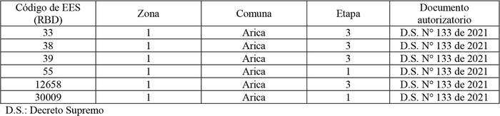 c) Los oficios Ord. N° 99, de fecha 09.08.2021, N° 107, de fecha 02.11.2021, ingreso Subtel N° 208.165, de fecha 30.12.2021 y N° 9, de fecha 04.03.2022, ingreso Subtel N° 37.404, de fecha 07.03.2022, mediante los cuales Mineduc informa a Subtel la baja en el Servicio de Conectividad comprometido de seis (6) EES, de código RBD N°s. 33, 38, 39, 55, 12658 y 30009, pertenecientes a la Zona 1.