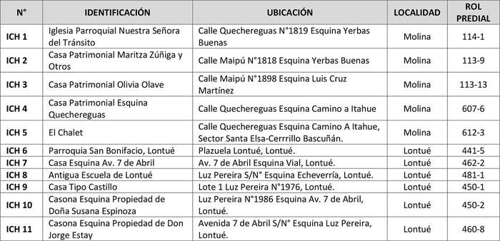 Los Inmuebles establecidos de Conservación Histórica por el presente Plan, en conformidad a lo que establece la LGUC y la OGUC, son los que se indican a continuación: