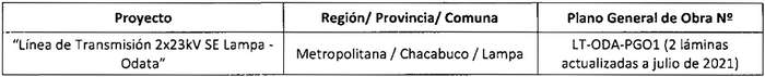 El proyecto se ubica en la comuna de Lampa, Provincia de Chacabuco de la Región Metropolitana. El recorrido del proyecto se inicia en el punto de inicio (Pi) coincidente con el vértice inicial (Vi) ubicado en el límite de la subestación Lampa (existente), al costado sur de la Avenida El Alfalfal, y finaliza en el punto final definido como (Pf) ubicado al interior del terreno sobre el cual se emplazará la futura subestación Odata. La longitud total del proyecto es de 3.011,30 metros. Tanto la Subestación Lampa existente como la futura Subestación Odata, no forman parte de la solicitud.