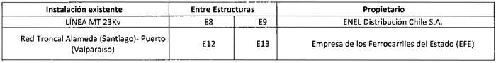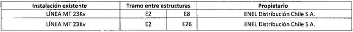 En su recorrido, la "Línea de Transmisión 2x23kV SE Lampa - Odata" afectarán las siguientes líneas eléctricas, obras e instalaciones existentes que se indican a continuación: