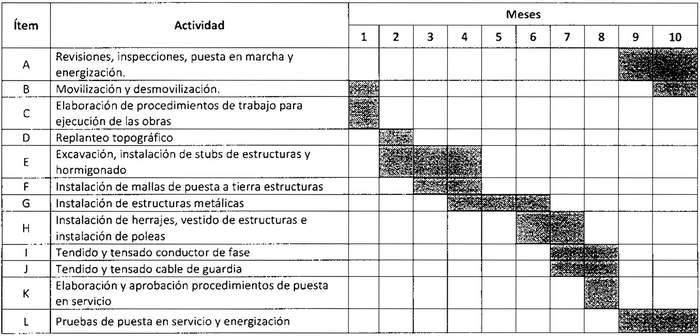 Artículo 9º.- El plazo de construcción de las obras del proyecto tendrá una duración de 10 meses, contados desde el inicio de los trabajos hasta su terminación. El plazo de 10 meses comenzará a transcurrir cumplidos 90 días hábiles desde la reducción a escritura pública del respectivo decreto de concesión eléctrica definitiva, sin perjuicio que estos trabajos podrán iniciarse con anterioridad a dicha fecha, en el evento de contar con todas las autorizaciones y derechos que lo habiliten para ello. Los plazos para la iniciación de los trabajos y su terminación por etapas y secciones son los siguientes: