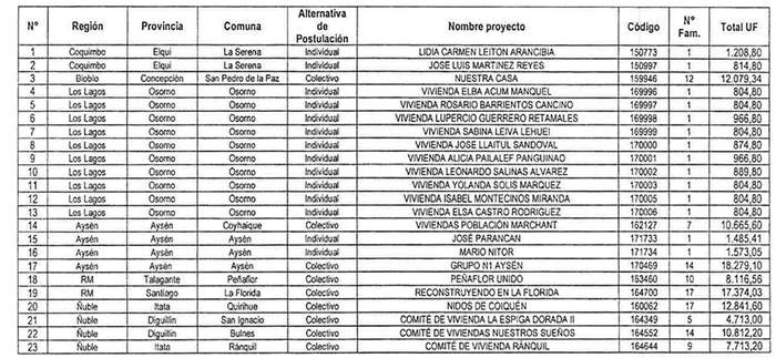 3. Apruébase la siguiente nómina de proyectos seleccionados para el otorgamiento de subsidios del Programa Habitacional Fondo Solidario de Elección de Vivienda, con su respectivo financiamiento total, incluyendo los servicios de asistencia técnica y fiscalización técnica de obras, correspondientes a 23 proyectos en la modalidad de Construcción en Sitio Propio, 9 de ellos postulados de manera colectiva en las regiones de Ñuble, Biobío, Aysén, Metropolitana, y 14 proyectos postulados de manera individual en las regiones de Coquimbo, Los Lagos y Aysén; y 1 proyecto en la modalidad Pequeños Condominios, todos parte del proceso de selección cuyo cierre de postulación se efectuó el día 30 de agosto de 2022, en el llamado efectuado por resolución exenta N° 148 (V. y U.), de 2022: