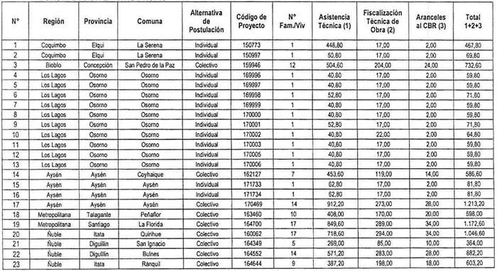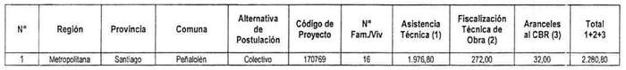 4. El monto del subsidio asignado de conformidad con el cuadro del Resuelvo 3 de esta resolución comprende los siguientes montos por concepto de Servicios de Asistencia Técnica, de Labores de Fiscalización Técnica de Obra y pago de Aranceles al Conservador de Bienes Raíces: