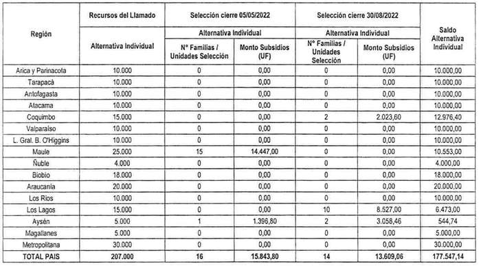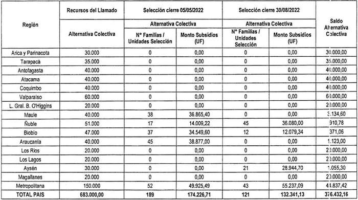 5. Los recursos comprometidos en los Resuelvos 3. y 4. de la presente resolución, para los proyectos seleccionados en el concurso que se llamó por resolución exenta N° 148 (V, y U.), de 2022, cuyo cierre de postulación se efectuó el día 30 de agosto de 2022, se resumen en el siguiente cuadro para cada región del país, incluyendo la suma total de familias beneficiadas y Unidades de Fomento comprometidas, considerando los montos de subsidio de los proyectos, incluidos sus respectivos servicios de asistencia técnica y fiscalización técnica de obras, según alternativa de postulación: