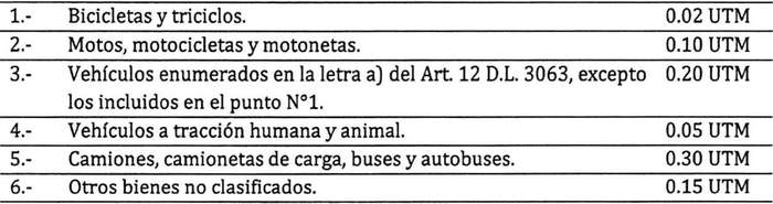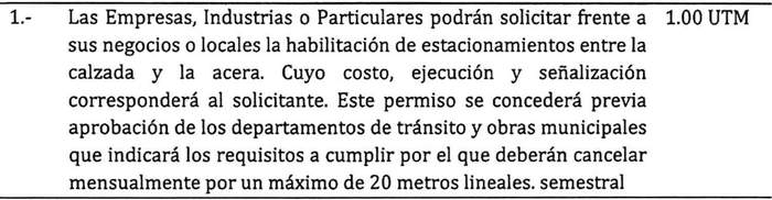 Artículo 8: El permiso de estacionamiento reservado en bienes nacionales de uso público en los casos que la Ley de Tránsito, Plan Regulador Comunal y el Municipio lo autorice estará gravado en los siguientes derechos: